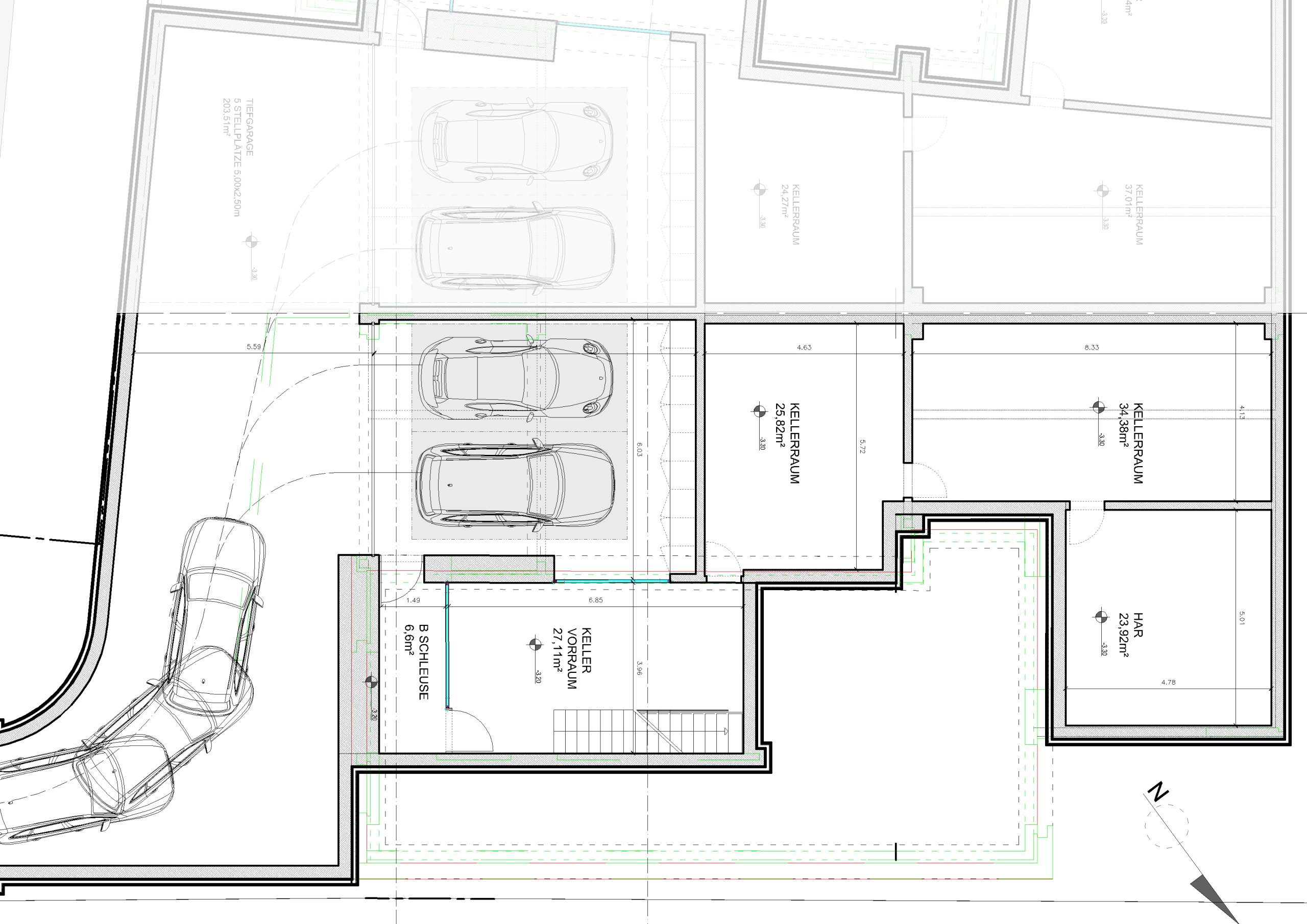 Der Zugang erfolgt über einen park ähnlich angelegte Auffahrt. Der Besucher wird von einem privaten Patio in Empfang genommen und zum Eingang geleitet. Die Sichtachsen öffnen sich und lassen den Blick bis in den Garten zu sobald man das Gebäude betritt. Alle Räume sind fliesend miteinander verbunden. Es gibt keine ersichtlichen Grenzen. Bei Bedarf kann die nötige Zonierung durch große Schiebeelemente erzeugt werden. Die Räume sind lichtdurchflutet und alle Flächen werden durch den geschützten Patio miteinander Verbunden. Alle Nutzräume liegen kompakt und gut zugänglich nahe am Eingangsbereich. Zwei Tiefgaragenstellplätze mit direktem Zugang zum Wohnhaus und großzügige Räume im Untergeschoss zur freien Verwendung runden die Nutzung ab.
